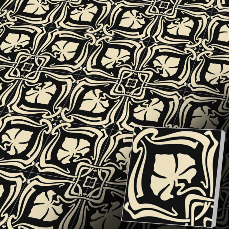 Zementfliese mit floralem Design - in Schwarz-Beige - im Format 17x17 cm